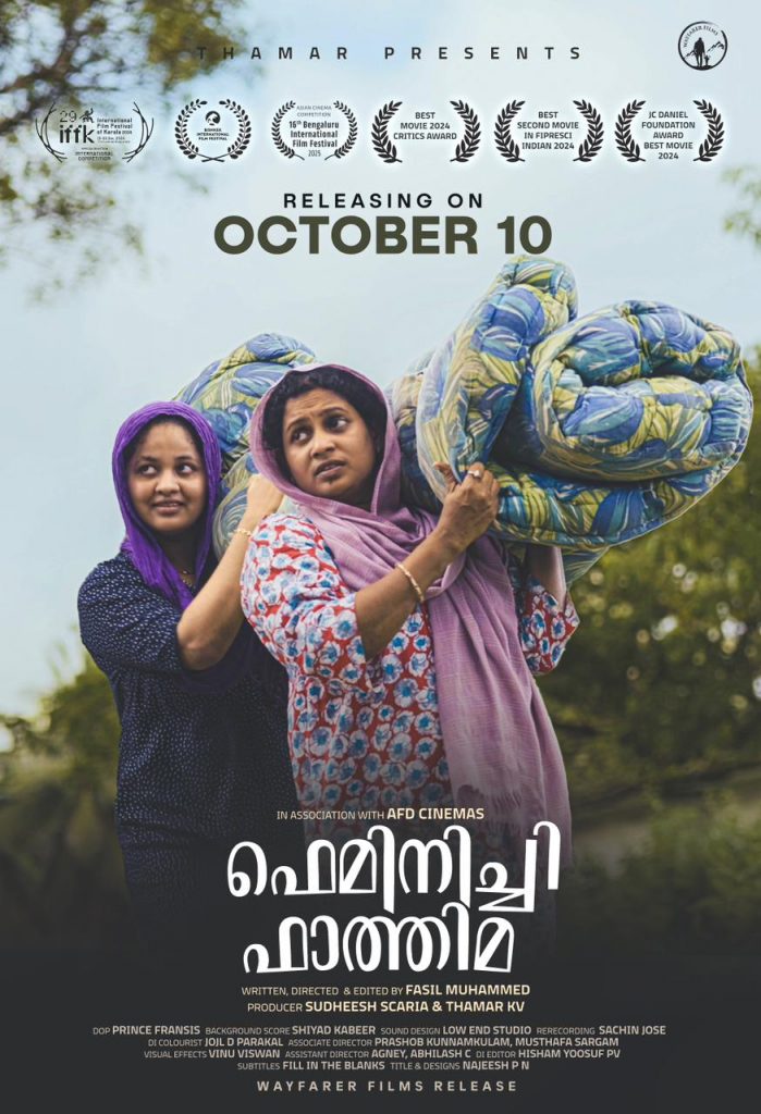 ഫാസിൽ മുഹമ്മദ് രചനയും സംവിധാനവും നിർവഹിച്ച “ഫെമിനിച്ചി ഫാത്തിമ” ഒക്ടോബർ 10 ന് തിയേറ്ററുകളിൽ എത്തും. ദുൽഖർ സൽമാൻ്റെ വേഫെറർ ഫിലിംസ് ആണ് ചിത്രം കേരളത്തിൽ വിതരണം ചെയ്യുന്നത്. എഎഫ്ഡി സിനിമാസുമായി സഹകരിച്ച് സുധീഷ് സ്കറിയയും തമർ കെവിയും ചേർന്ന് നിർമ്മിച്ച ഈ ചിത്രം അവതരിപ്പിക്കുന്നത് തമർ. ഇതിനോടകം തന്നെ പ്രശസ്ത ചലച്ചിത്രമേളകളിൽ വലിയ നിരൂപക പ്രശംസയാണ് ചിത്രം നേടിയെടുത്തത്.